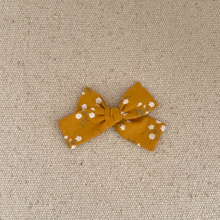 Le noeud antiglisse est en coton moutarde fleuris , il mesure environ 7 cm .