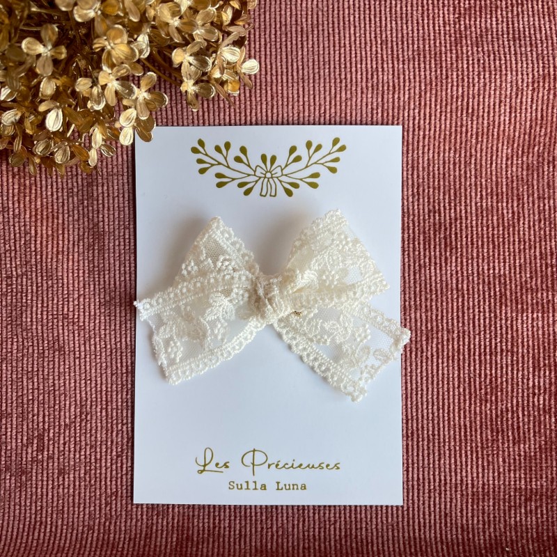Sa pince doré rosé mesure 4 cm , le noeud est cousu dessus à la main .