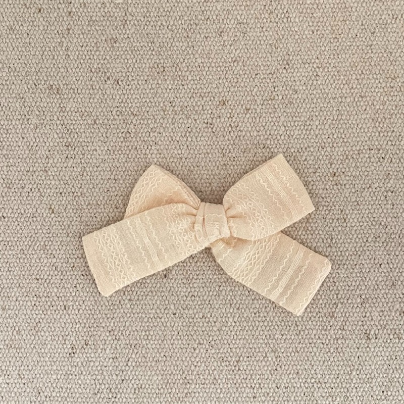 Le noeud est en coton beige brodé , il mesure environ 9,5 cm .
