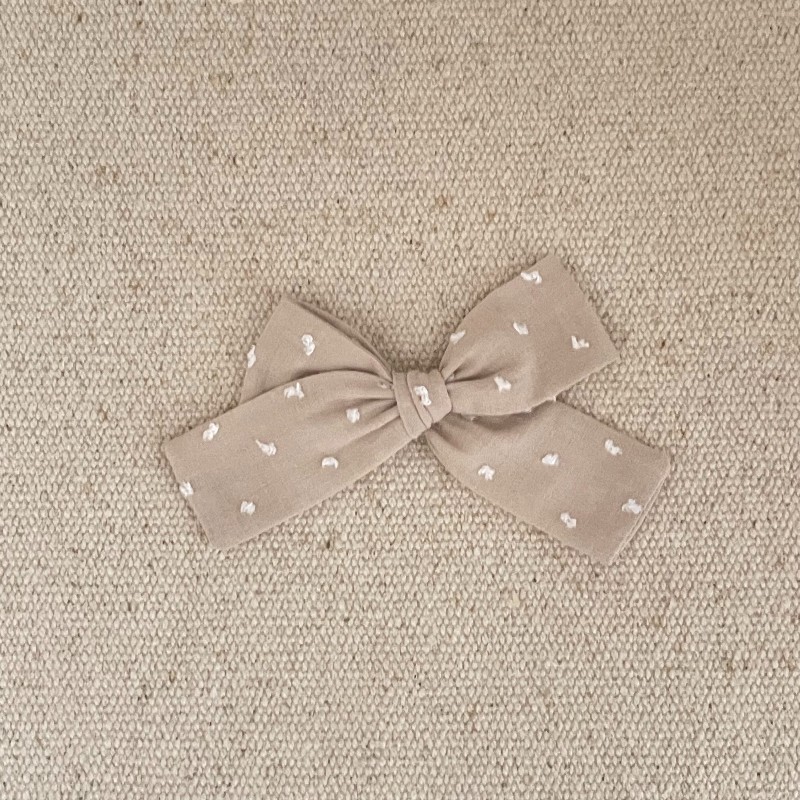 Le noeud est en plumetis beige , il mesure environ 9,5 cm .