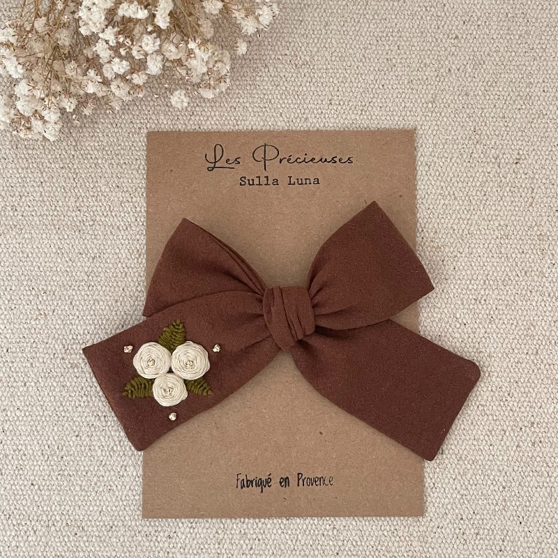 Le noeud est en coton lavé chocolat tout brodé à la main , il mesure environ 14 cm et sa pince crocodile de 6,5 cm.