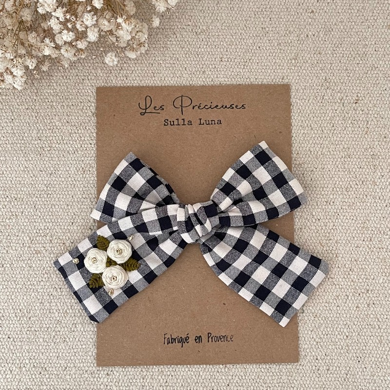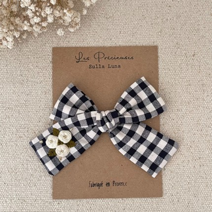 Le noeud est en coton vichy gaufré noir tout brodé à la main , il mesure environ 14 cm et sa pince crocodile de 6,5 cm.