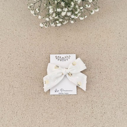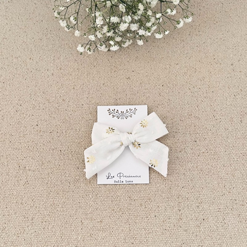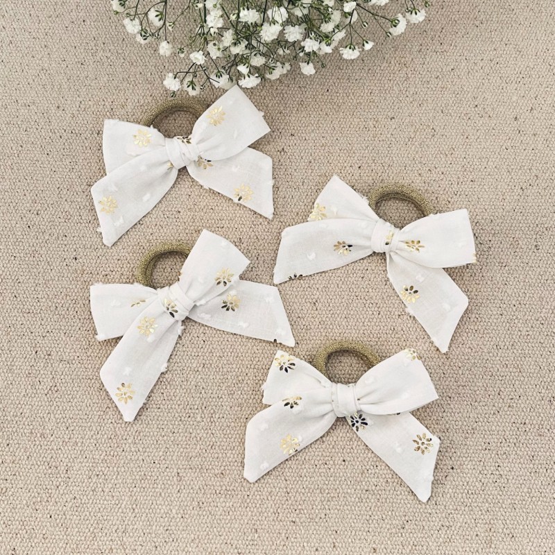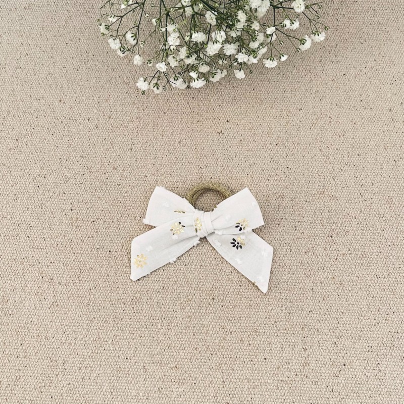Le noeud mesure environ 9,5 cm et son petit élastique en nylon doré irisé mesure environ 3 cm de diamètre .