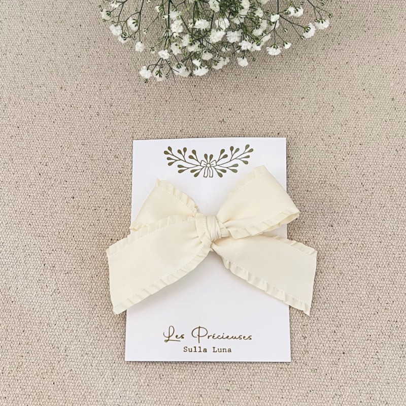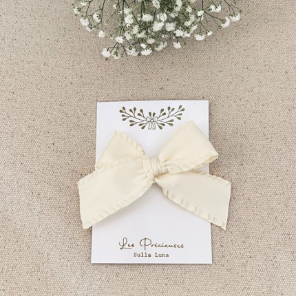Le noeud mesure environ 14 cm et sa pince crocodile doré de 6 cm.La pince n'est pas collée , ce qui vous permet de la positionner dans le sens que vous souhaitez.