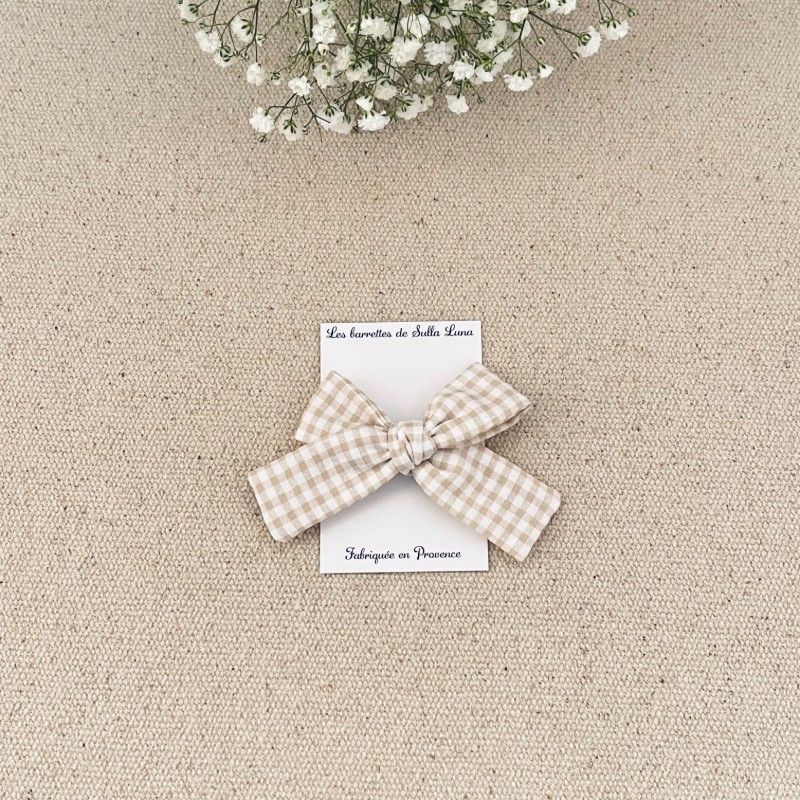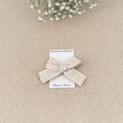 Sa pince clic clac avec petit peigne mesure 2,8 cm , le noeud est cousu dessus à la main .