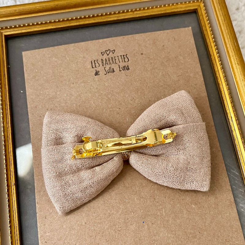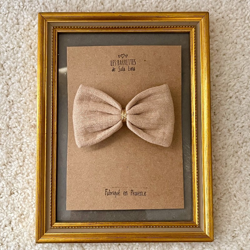 Le noeud est en gaze doré lurex , il mesure environ 9 cm .
