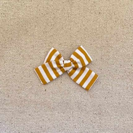 Le noeud antiglisse est en gaze moutarde rayé lurex , il mesure environ 7 cm .
