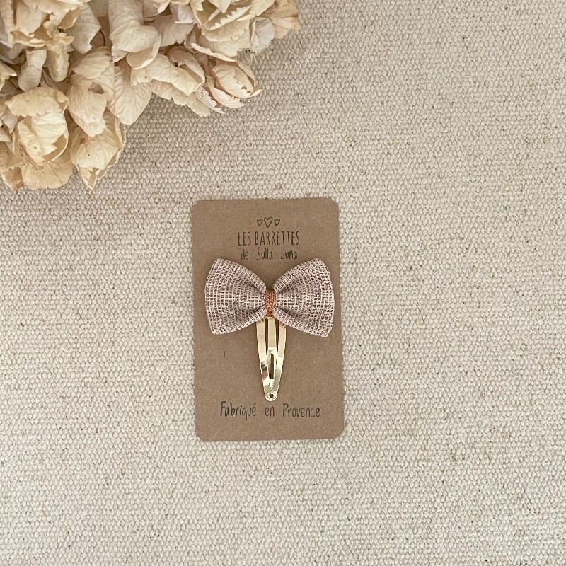 Sa pince doré rosé mesure 4 cm , le noeud est cousu dessus à la main .