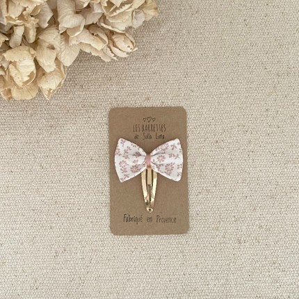 Sa pince doré rosé mesure 4 cm , le noeud est cousu dessus à la main .