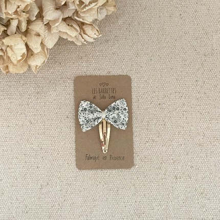 Sa pince doré rosé mesure 4 cm , le noeud est cousu dessus à la main .