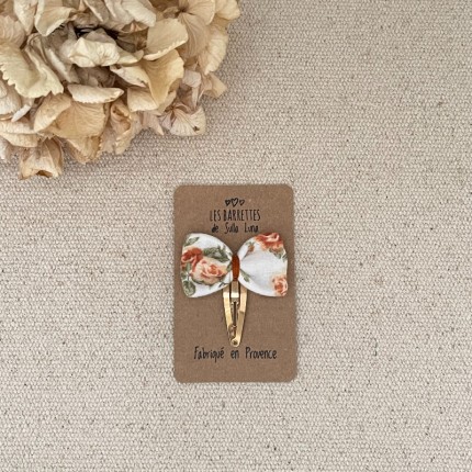 Sa pince doré rosé mesure 4 cm , le noeud est cousu dessus à la main .