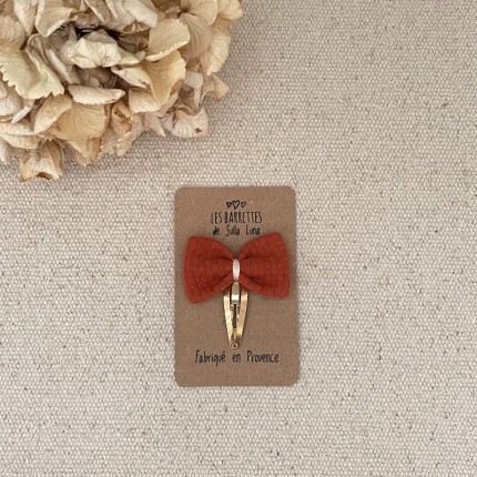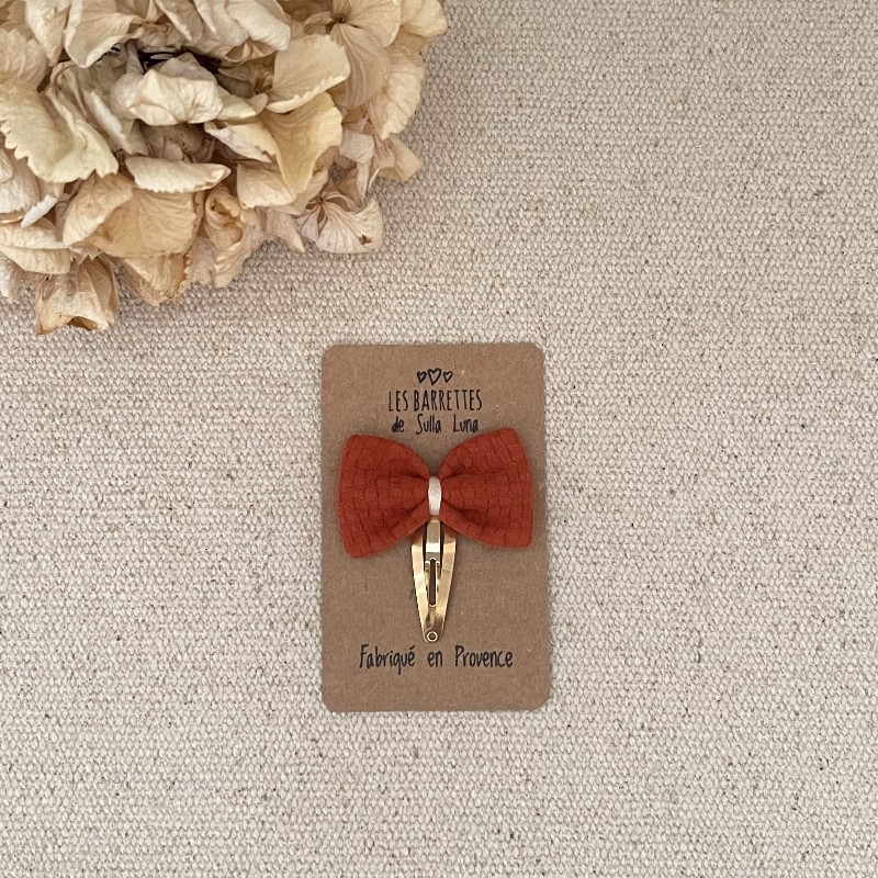 Sa pince doré rosé mesure 4 cm , le noeud est cousu dessus à la main .