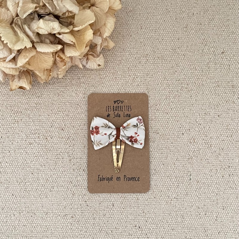 Sa pince doré rosé mesure 4 cm , le noeud est cousu dessus à la main .