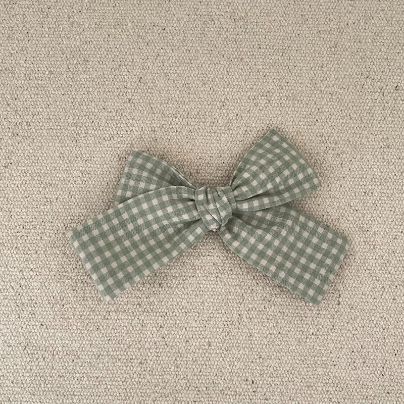 Le noeud est en coton vichy amande , il mesure environ 14 cm et sa pince crocodile de 6,5 cm.