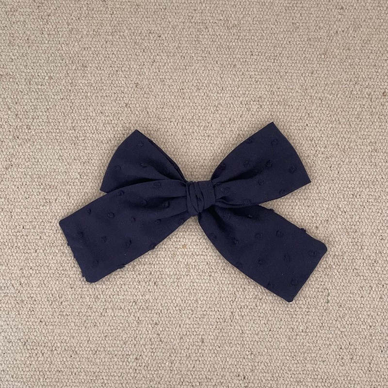 Le noeud est en plumetis de coton bleu marine , il mesure environ 14 cm et sa pince crocodile de 6,5 cm.