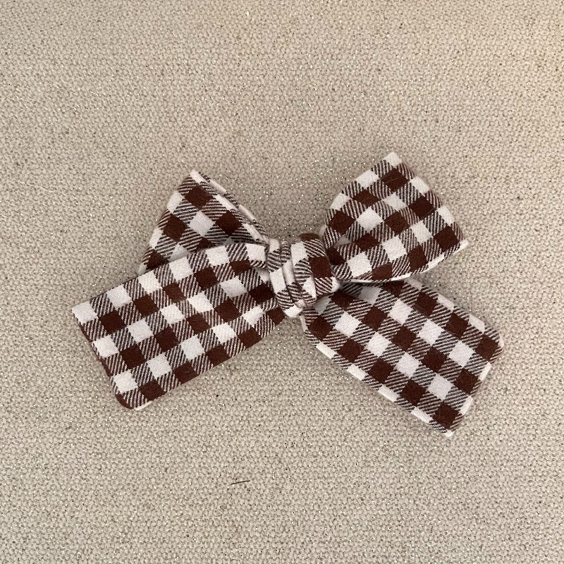 Le noeud est en coton vichy amande , il mesure environ 14 cm et sa pince crocodile de 6,5 cm.