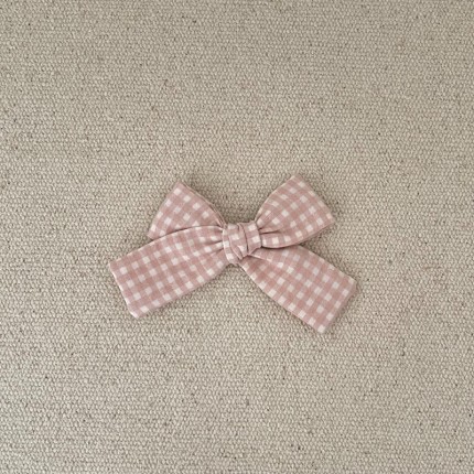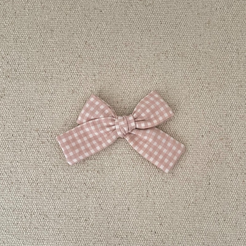 Le noeud est en gaze vichy rose tendre , il mesure environ 9,5 cm .