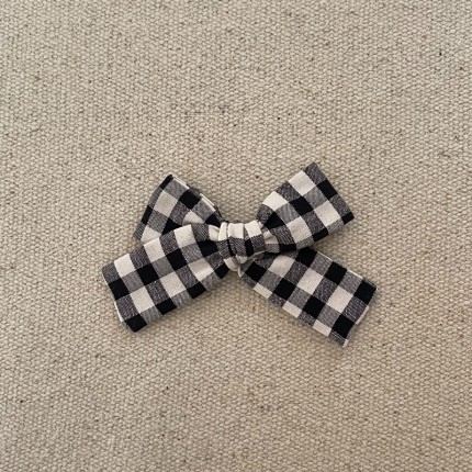 Le noeud est en coton vichy gaufré noir , il mesure environ 9,5 cm .