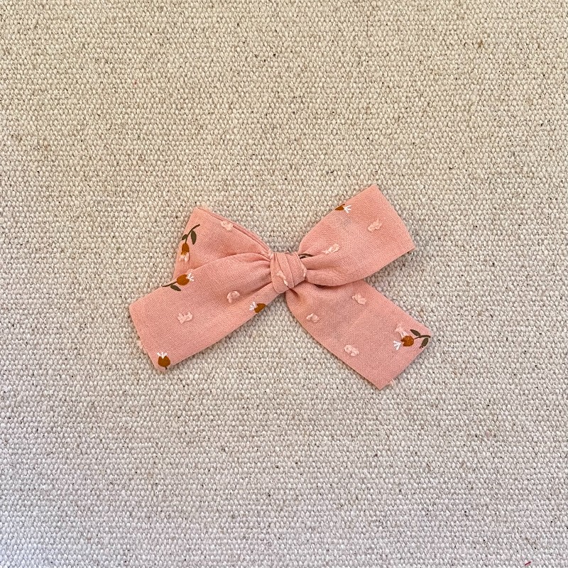 Le noeud est en plumetis de coton avec des petites tulipes , il mesure environ 9,5 cm .
