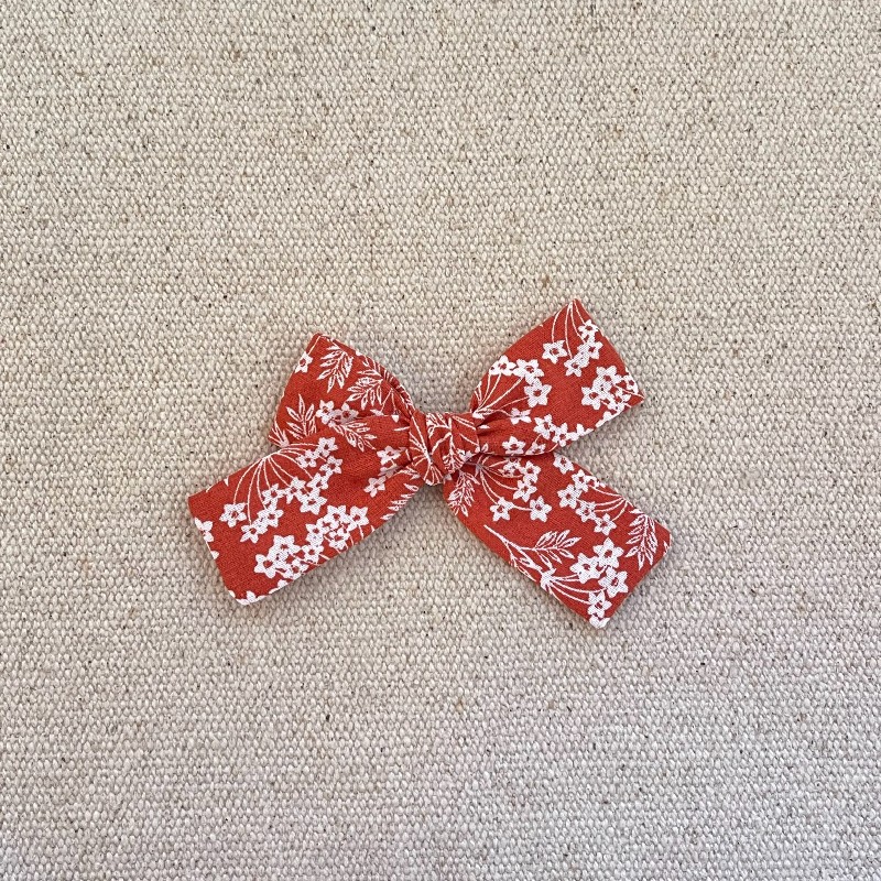 Le noeud est en plumetis de coton avec des petites tulipes , il mesure environ 9,5 cm .