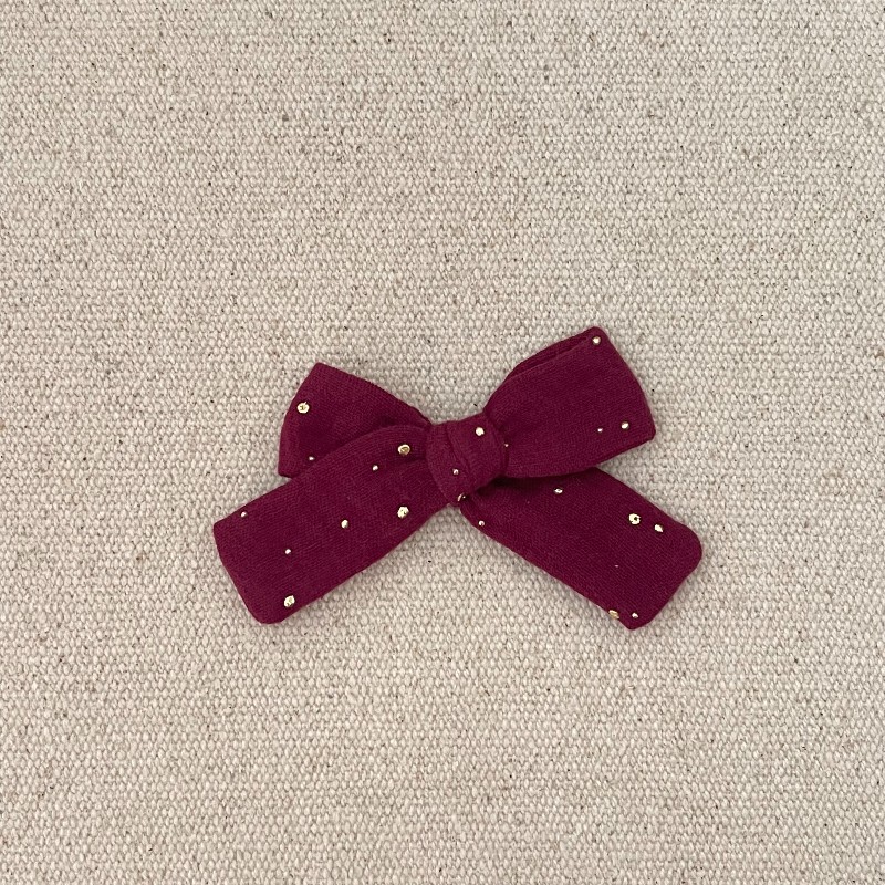 Le grand noeud est en gaze de couleur mûre à pois doré , il mesure environ 9,5 cm .