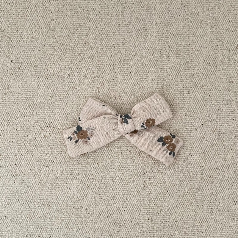 Le noeud est en gaze bio avec des petites fleurs , il mesure environ 9,5 cm .