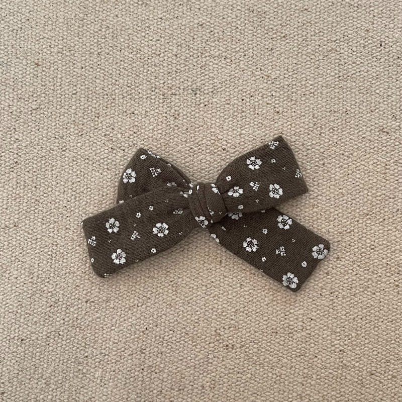 Le noeud est en gaze grège avec des petites fleurs , il mesure environ 9,5 cm .