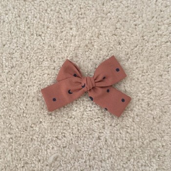 Le grand noeud est en gaze de couleur terre cuite à pois doré , il mesure environ 9,5 cm .