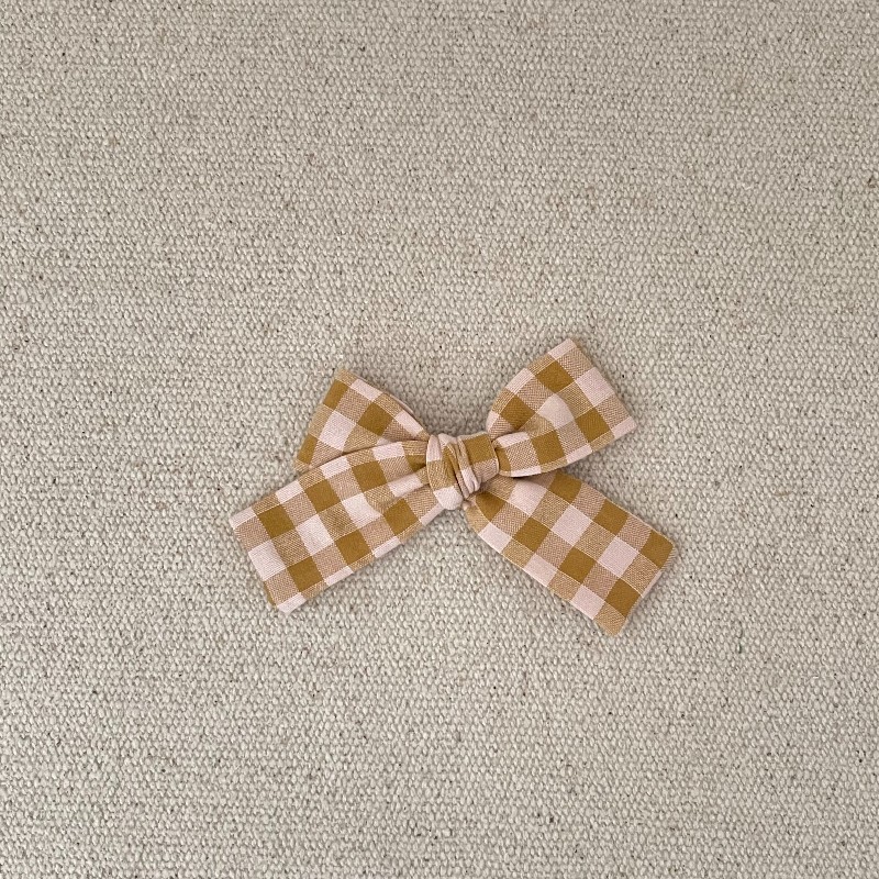 Le noeud est en coton vichy gaufré miel , il mesure environ 9,5 cm .