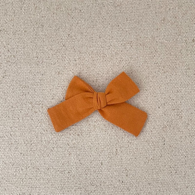 Le noeud est en coton lavé orange brûlée , il mesure environ 9,5 cm .