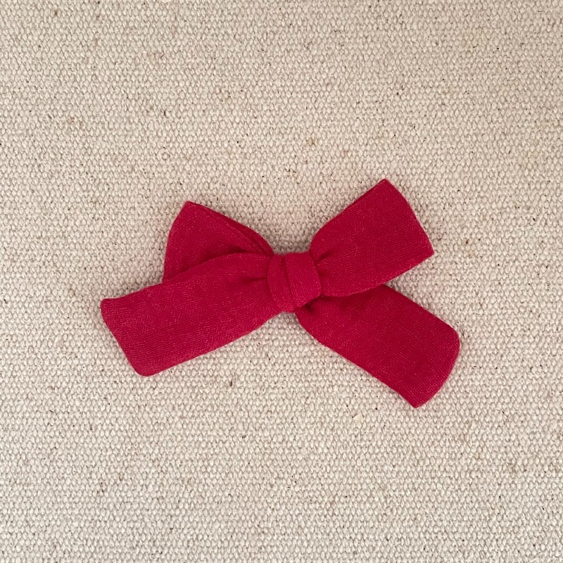 Le noeud est en gaze rouge , il mesure environ 9,5 cm .