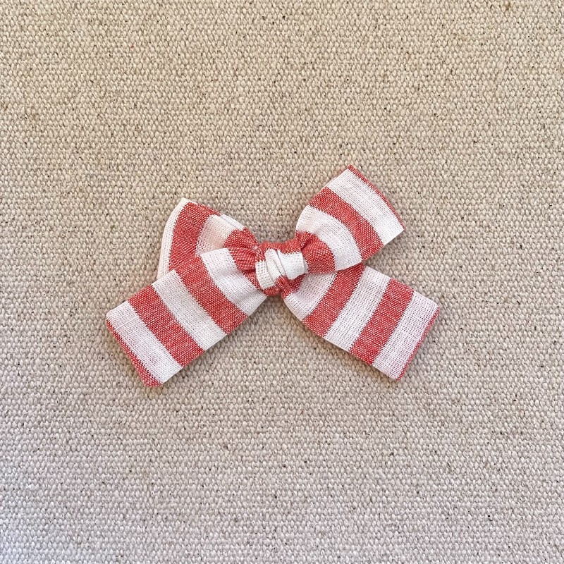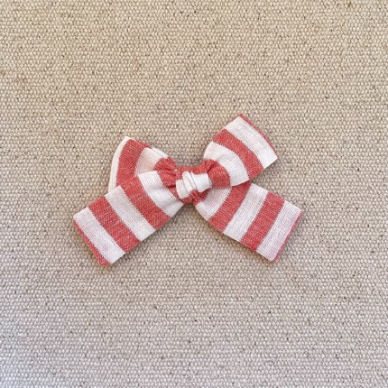 Le noeud est en coton rayé rouge & blanc avec un léger fil de lurex argenté , il mesure environ 9,5 cm .