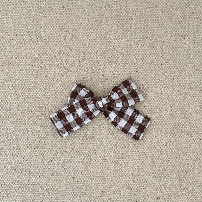 Le noeud est en coton vichy chocolat , il mesure environ 9,5 cm .