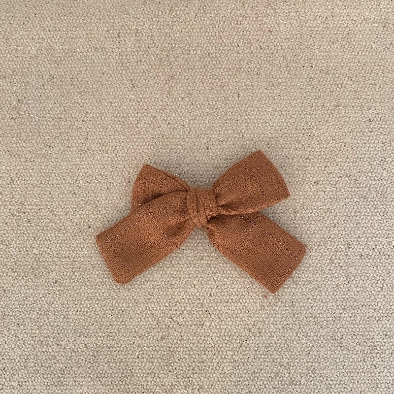 Le grand noeud est en gaze grège rayé doré , il mesure environ 9,5 cm .