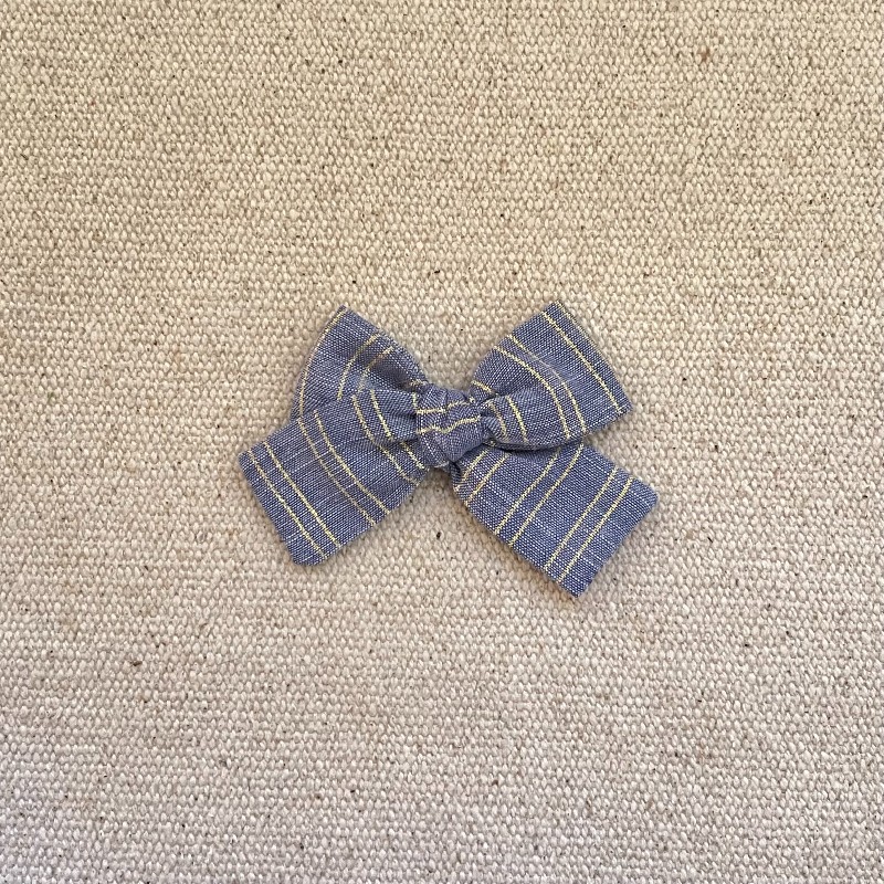 Le noeud antiglisse est en chambray bleu demin rayé doré , il mesure environ 7 cm .