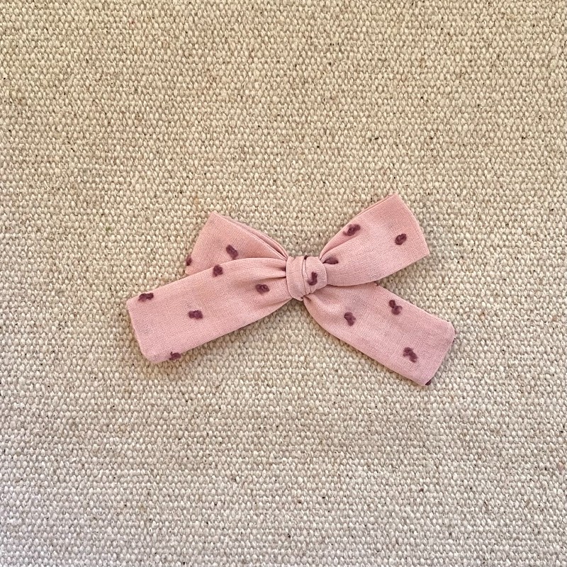 Le noeud noué est en coton rose avec des plumetis vieux rose , il mesure environ 8 cm .