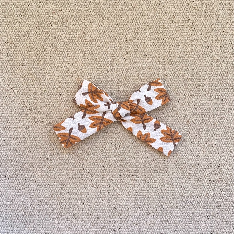 Le noeud noué est en coton avec des imprimés feuilles et glands , il mesure environ 8 cm .