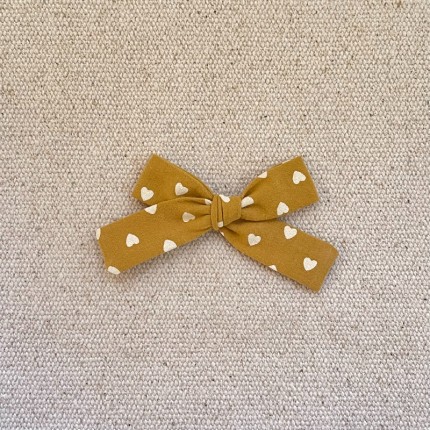 Le noeud noué est en coton de couleur moutarde avec des petits coeurs , il mesure environ 8 cm .