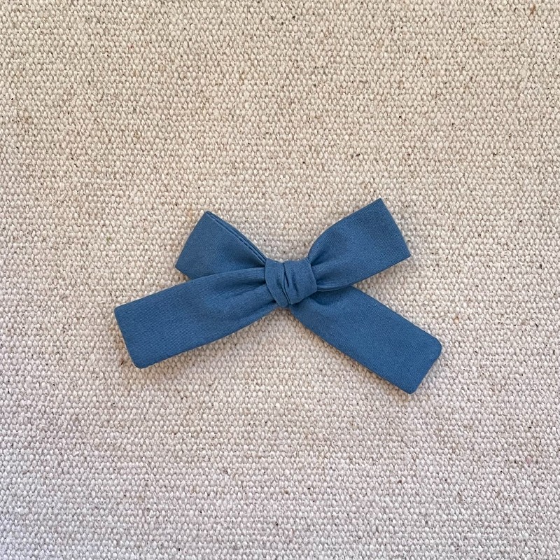 Le noeud noué est en coton uni de couleur bleu denim , il mesure environ 8 cm .