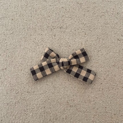 Le noeud noué est vichy de couleur taupe , il mesure environ 8 cm .