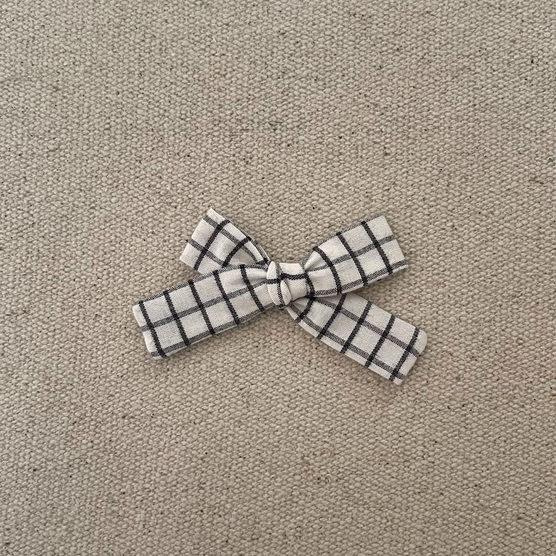 Le petit noeud est en coton vichy gris souris , il mesure environ 8 cm .