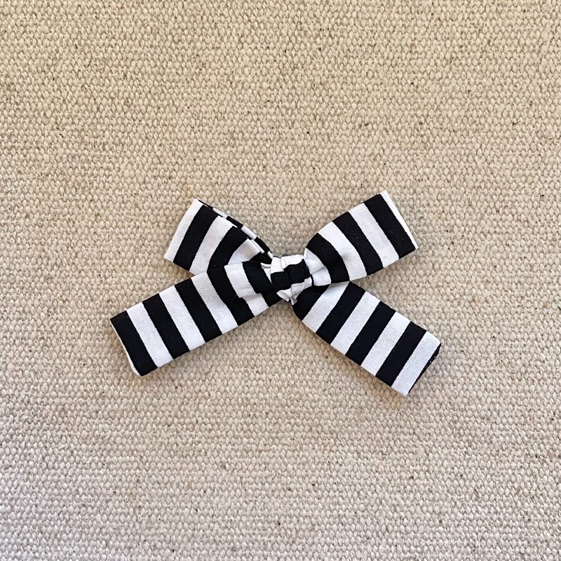 Le noeud noué est en coton rayé noir , il mesure environ 8 cm .