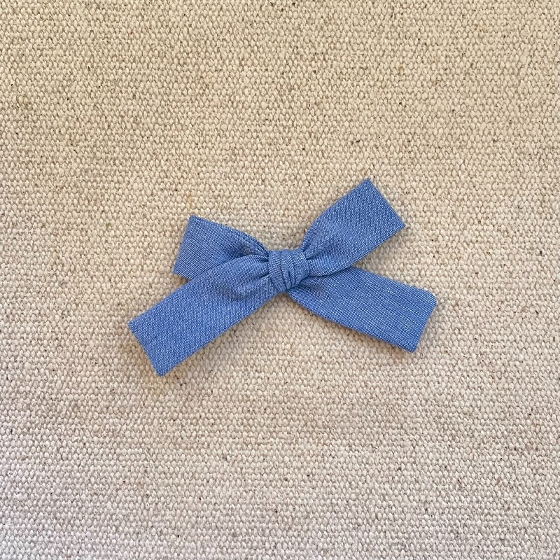 Le noeud noué est en coton chambray bleu jean , il mesure environ 8 cm .