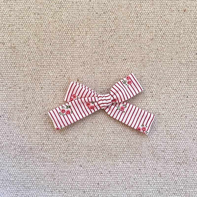 Le noeud noué est en coton rayé rouge avec des imprimés fleurs , il mesure environ 8 cm .
