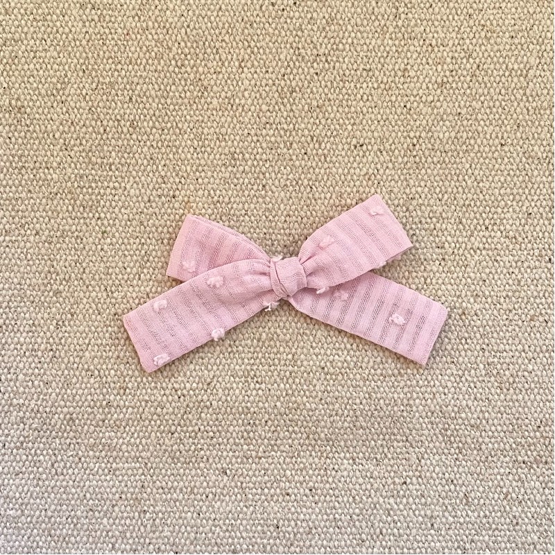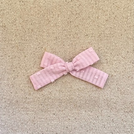 Le noeud noué est en plumetis rayé de couleur rose , il mesure environ 8 cm .