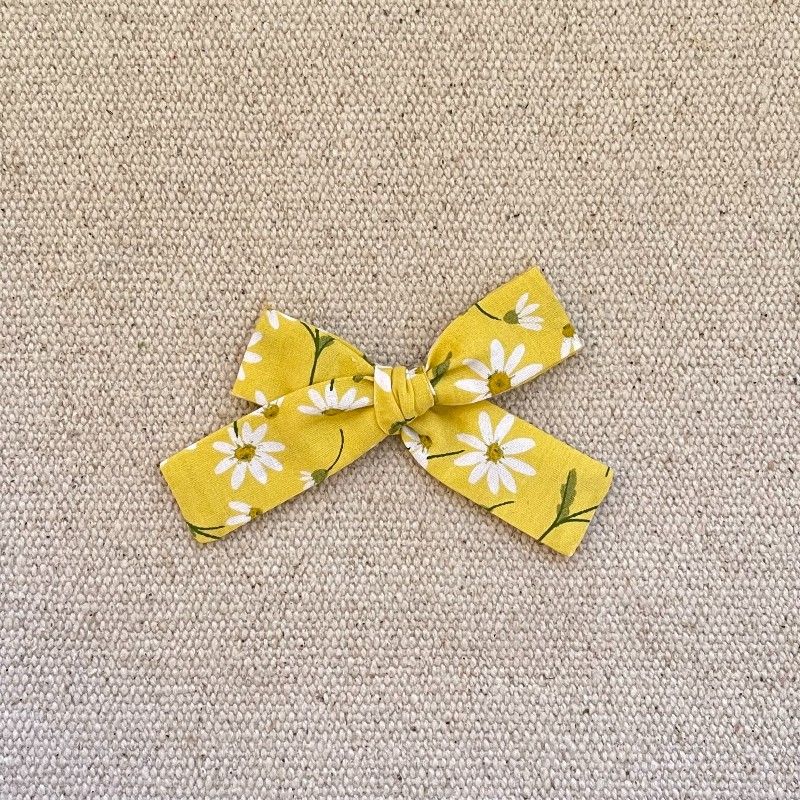 Le noeud noué est en coton jaune avec des pâquerettes , il mesure environ 8 cm .