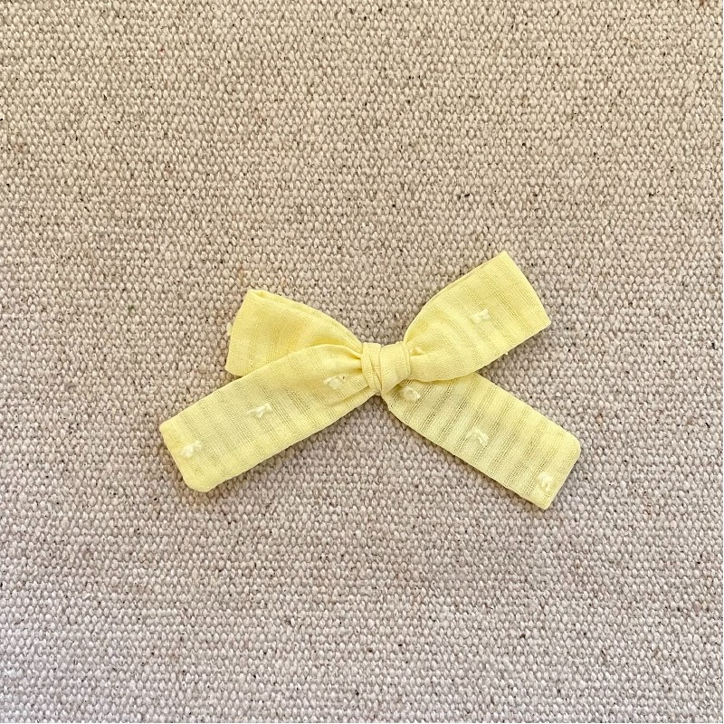 Le noeud est en coton vichy gaufré jaune , il mesure environ 9,5 cm .