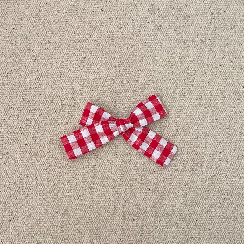 Le noeud noué est en coton vichy rouge , il mesure environ 8 cm .