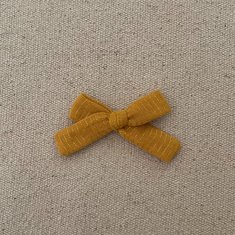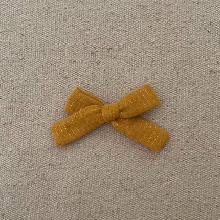 Le noeud noué est en gaze moutarde rayé lurex , il mesure environ 8 cm .