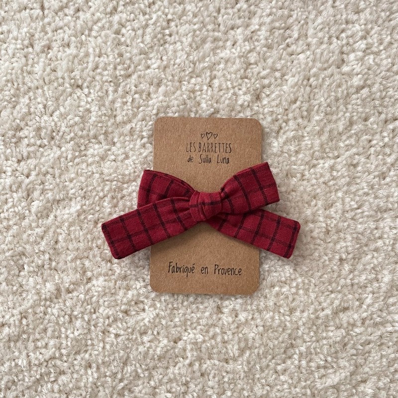 Le noeud noué est en coton vichy bordeaux , il mesure environ 8 cm .
